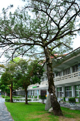 *孔廟近照,如此小的孔廟卻是五臟俱全(左);校園中的松樹,不知是否與日本時代的人喜愛種植松樹有關?(右)