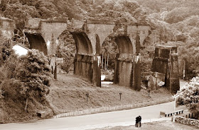 這次地理實察的課程考察第一站,來到三義鄉的龍騰斷橋。龍騰是地名,原名魚籐坪,斷橋則是指舊山線鐵道跨越龍騰溪的魚籐坪橋,紅磚外觀,內部則有夯實的礫土,多橋墩,每個橋墩間互為拱形,造型優美,雖然已經斷了,不過更增添了歷史滄桑的味道,讓人不禁要拿起相機猛拍。